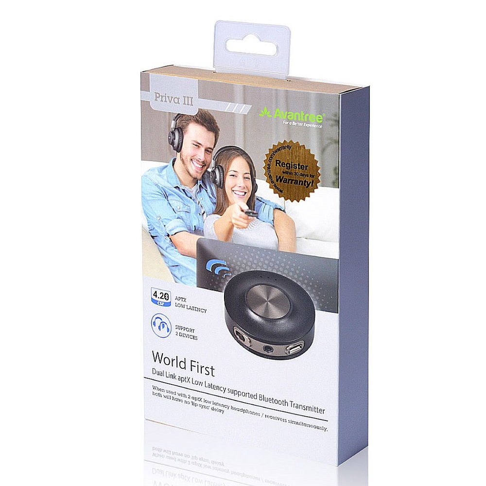 Avantree Priva III este un adaptor Bluetooth transmitter ce incorporeaza ultima tehnologie „aptX” decoder pentru transmiterea muzicii sau a sunetului la calitate HD. Adaptorul Priva este simplu de folosit si pemite oricarui dispozitiv Bluetooth sa se conecteze la el. Poti sa-l folosesti pentru a transmite sunetul unui film sau joc de pe Tv sau calculator catre castile tale Bluetooth.