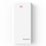 Baterie externa Romoss Sense 6 LED alb , 20000 mAh , dual USB, ce incorporeaza un afisor digital LED ce afiseaza in procente capacitatea disponibila a acumulatorului.