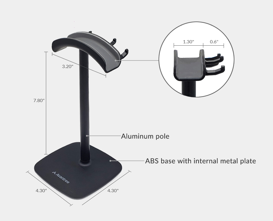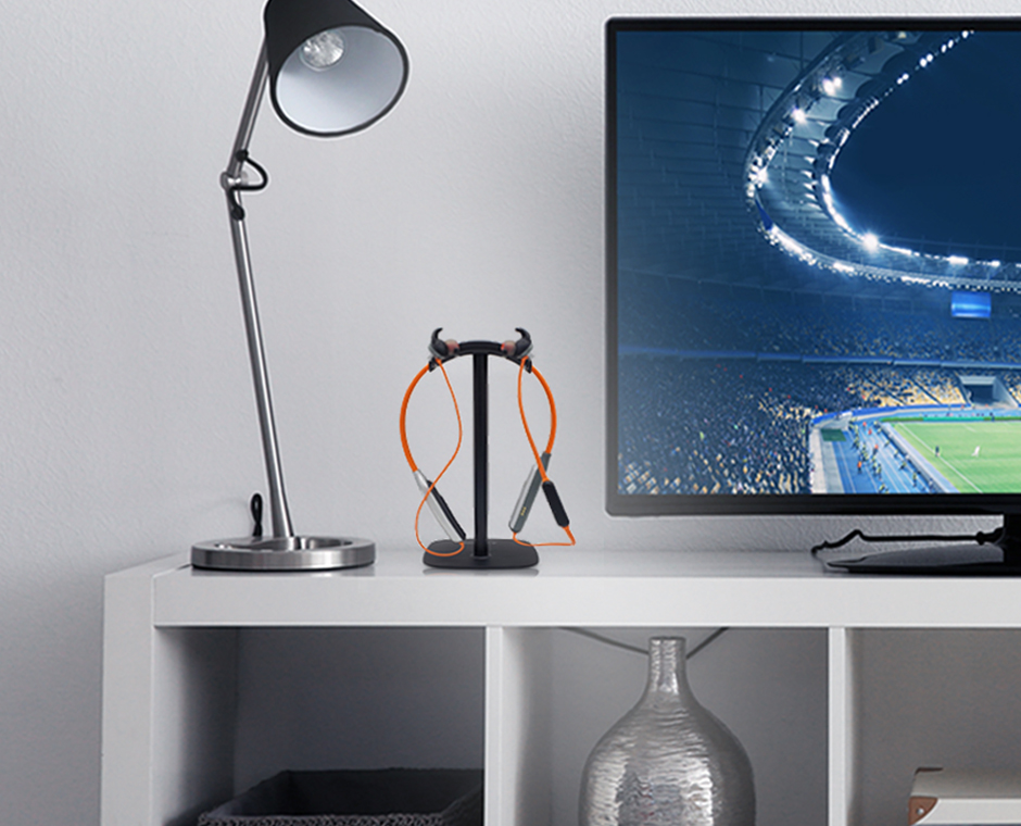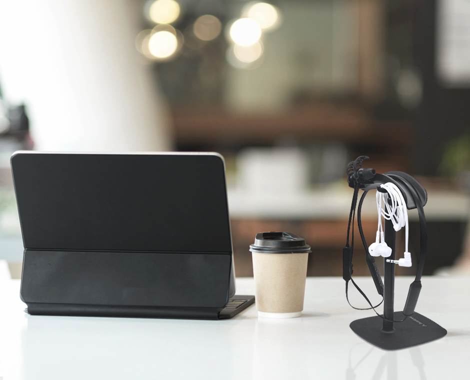 HS910 a fost creat pentru a ține două sau mai multe căști intraauriculare cu fir sau fără fir sau căști cu bandă pentru gat. Suportul are o bază, un blat curbat anti-alunecare și carlige din cauciuc pentru a agăța cu ușurință căștile.